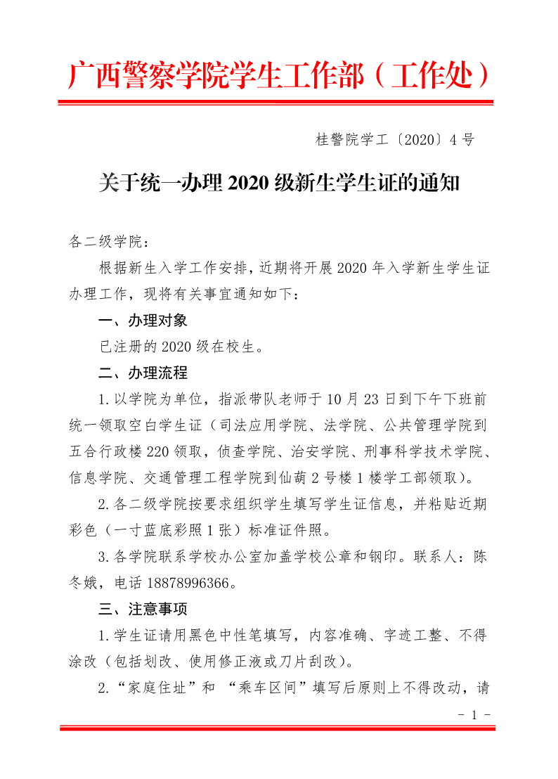 关于统一办理2020级新生学生证的通知