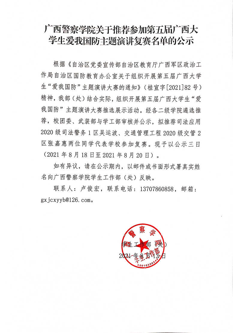 广西警察学院关于推荐参加第五届广西大学生爱我国防主题演讲复赛名单的公示