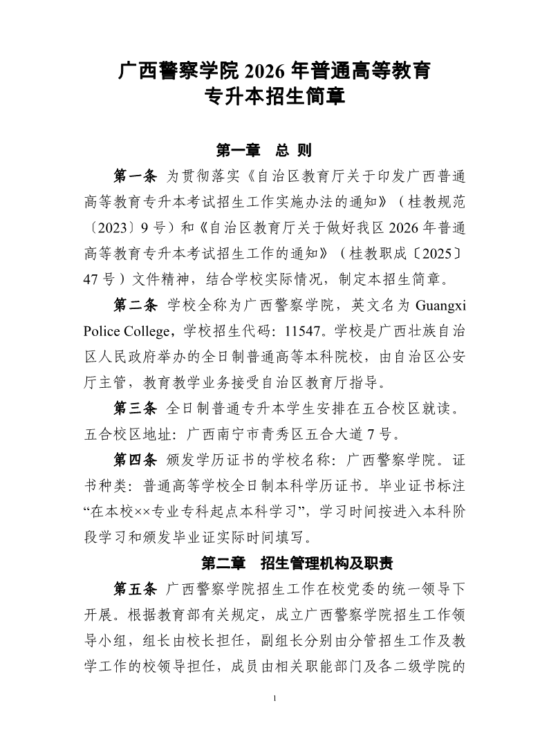 广西警察学院2026年普通高等教育专升本考试招生简章