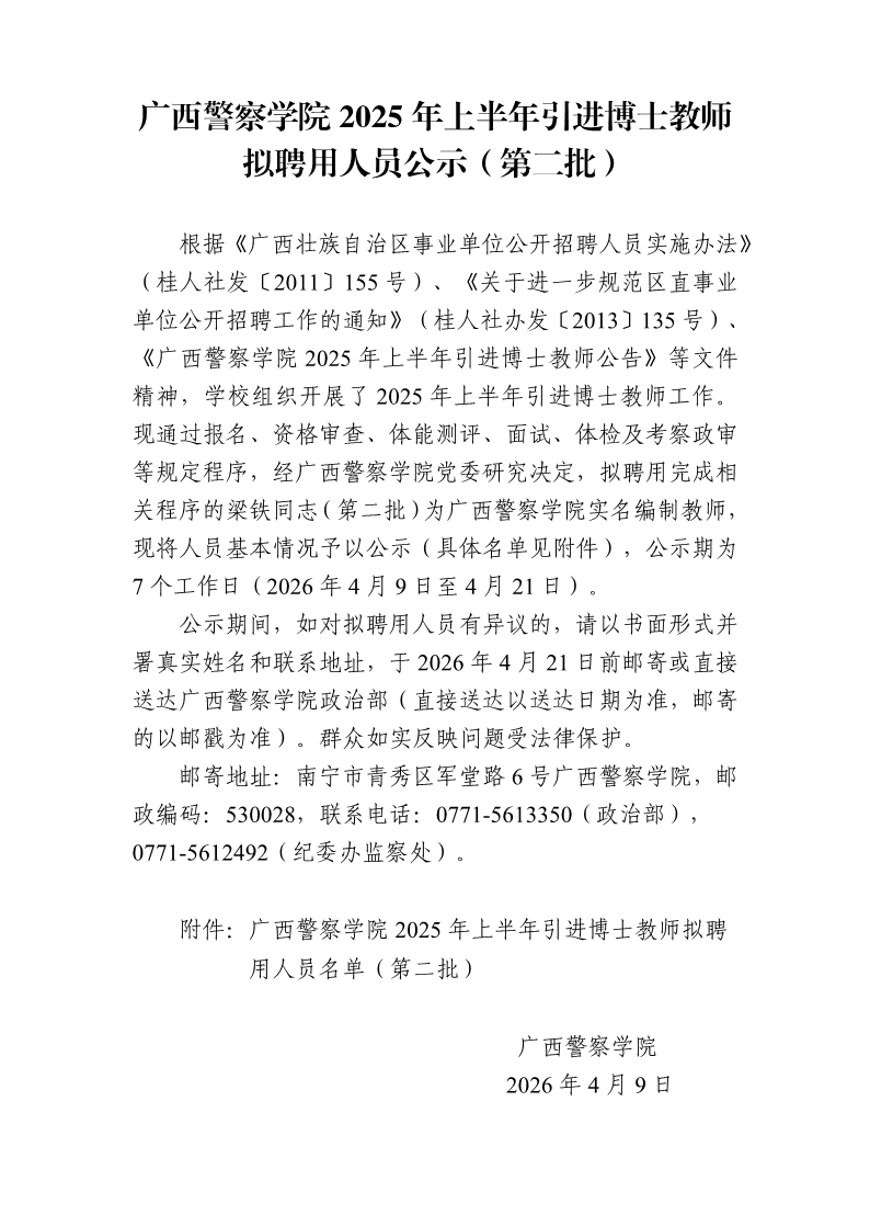 广西警察学院2025年上半年引进博士教师拟聘用人员公示(第二批) 来源: 发布时间:2026-04-09 17:59:15 浏览次数: 次 【字体:小 大】 附件:广西警察学院2025年上半年引进博士教师拟聘用人员名单(第二批).pdf 分享到: 【打印正文】