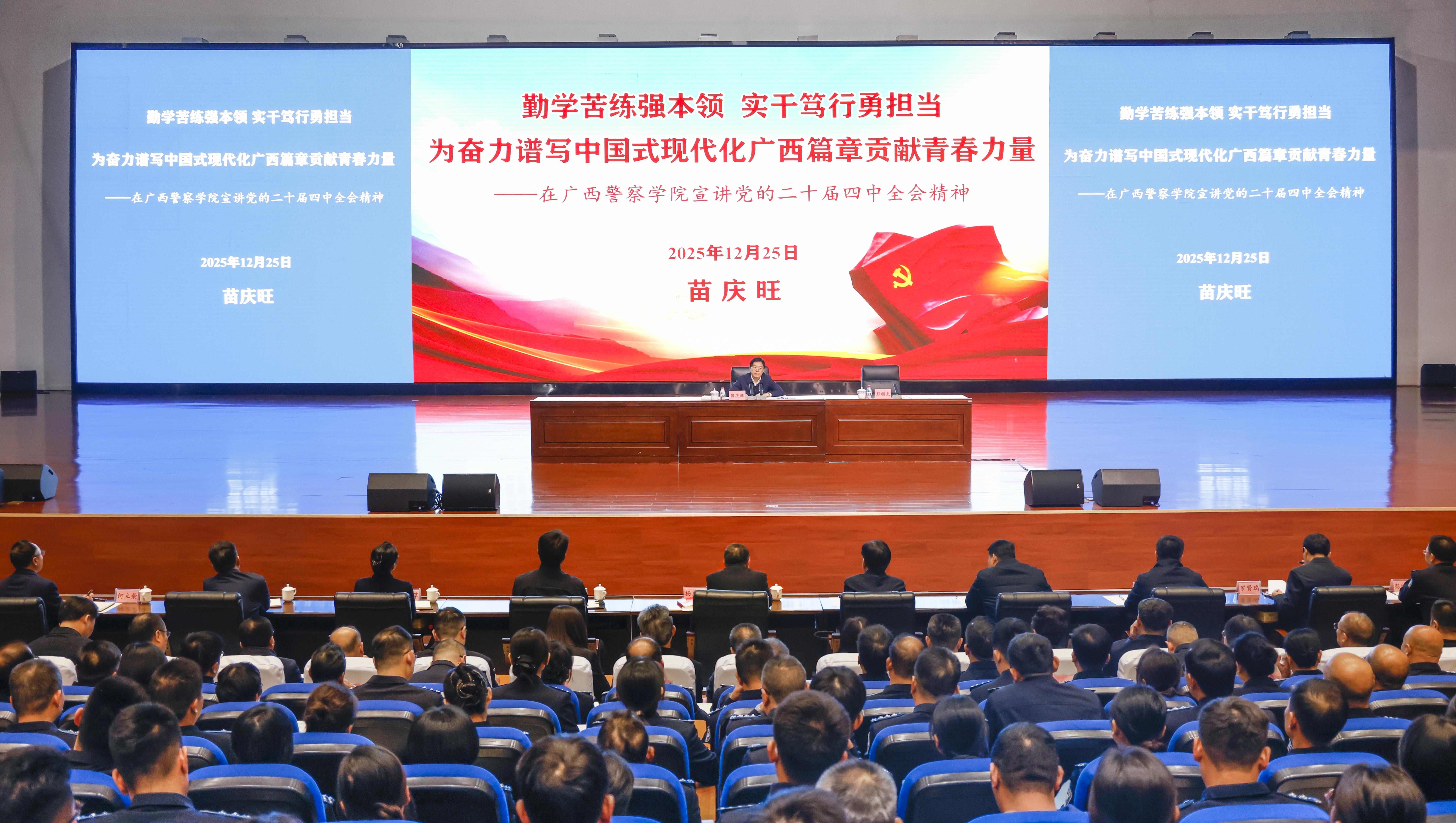 12月25日,自治区党委常委、政法委书记苗庆旺到广西警察学院,向师生代表及自治区政法单位负责同志宣讲党的二十届四中全会精神。