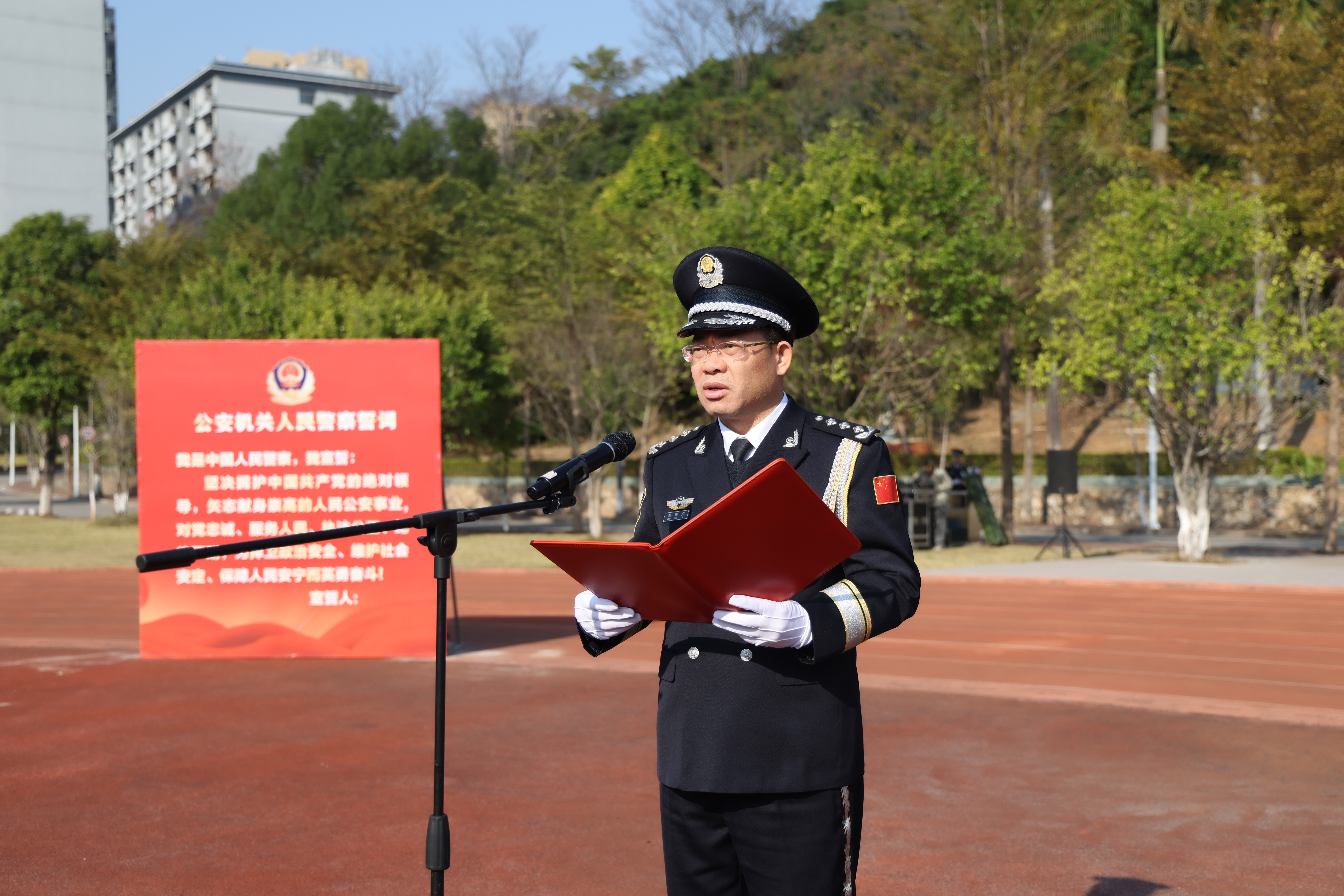 上午10时,民警教师在田径运动场集结,着装整齐,精神抖擞,肃然而立,队列整齐划一。仪仗队员迈着铿锵有力的步伐,护卫中国人民警察警旗行进至升旗台下。伴随着中国人民警察警旗冉冉升起,全体人员高唱《中国人民警察警歌》,并向警旗敬礼。随后,全体民警教师高举右拳,重温公安机关人民警察誓词,铮铮誓言、响彻现场。