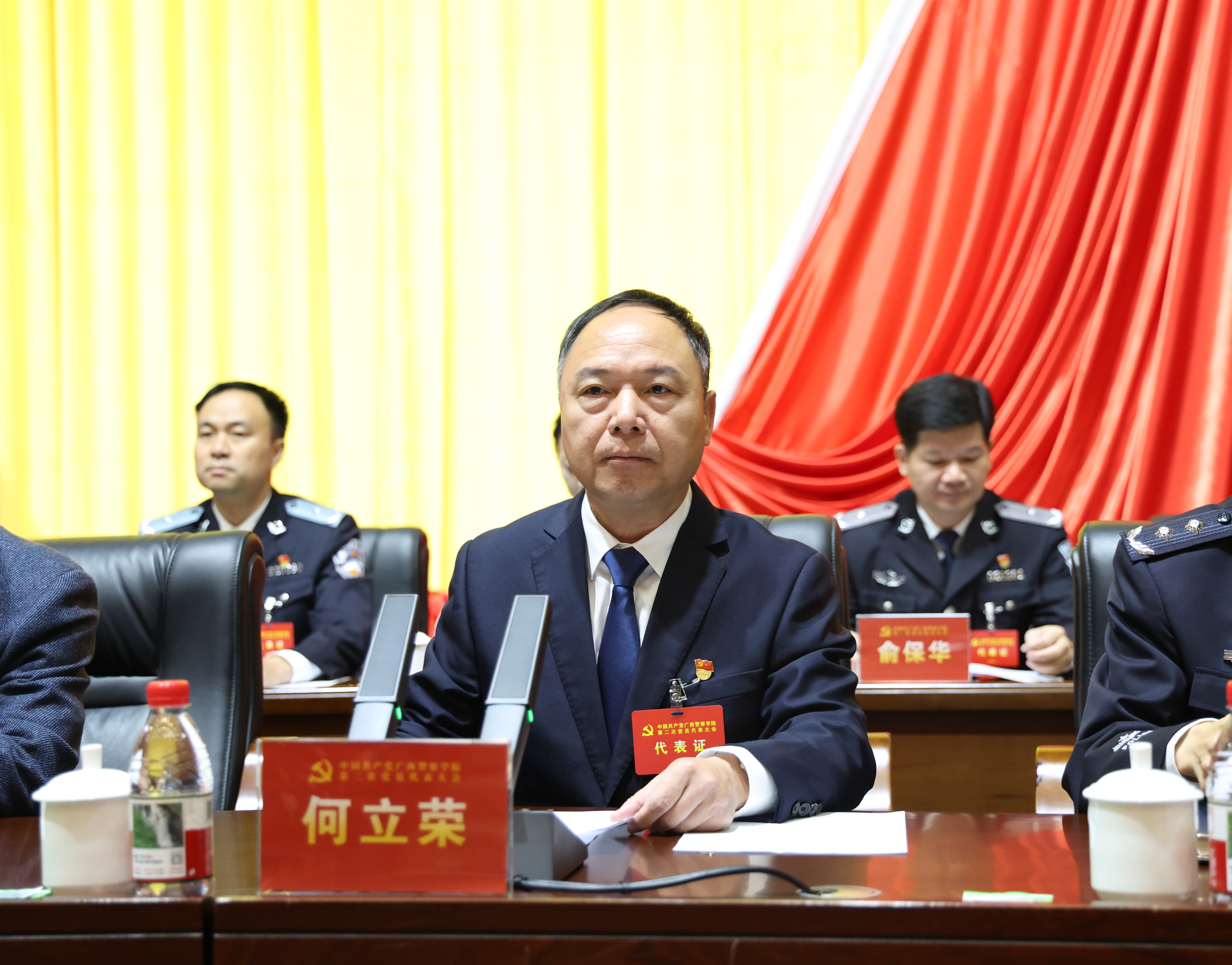 13日上午,中国共产党广西警察学院第二次党员代表大会隆重开幕。主会场气氛庄重热烈,主席台中央上方中国共产党党徽熠熠生辉,两侧十面红旗整齐排列,上方悬挂着“中国共产党广西警察学院第二次党员代表大会”的会标,会场悬挂着“改革实干勇担当 立德树人铸警魂 奋力谱写广西公安高等教育高质量发展新篇章”的条幅,振奋人心、催人奋进。