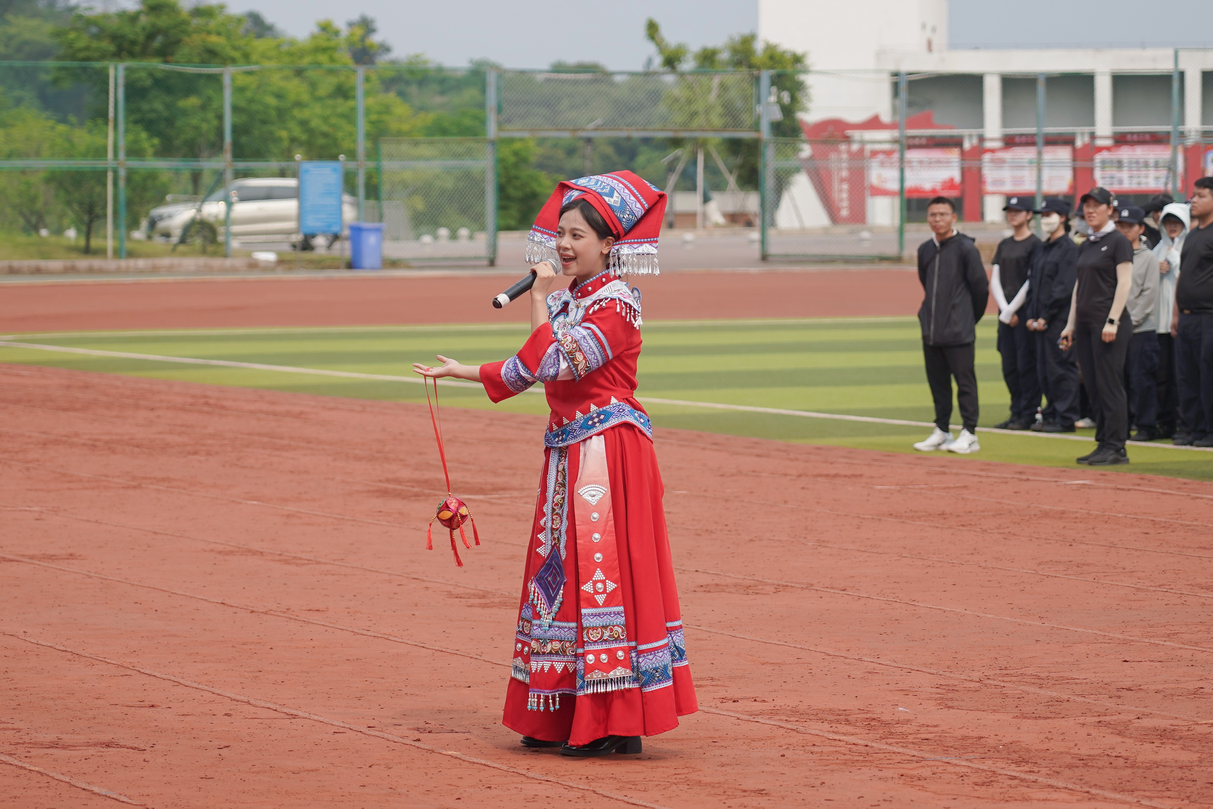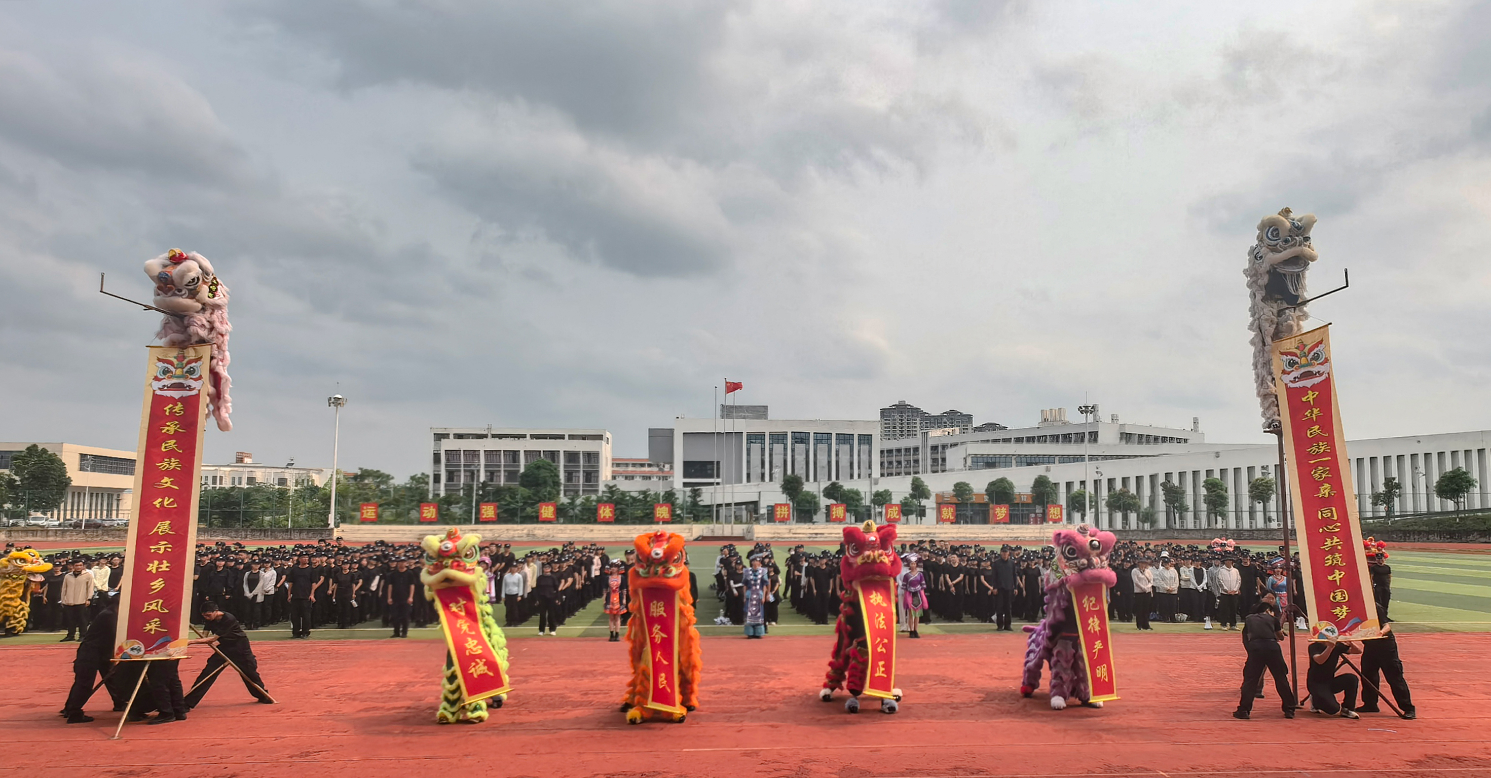 李兴林指出,“广西三月三” 是广西独具特色的民族传统节日,承载着深厚历史底蕴与灿烂民族文化,是中华民族文化宝库中的璀璨明珠。本次活动以“八桂校园石榴红 同心共筑中国梦” 为主题,“石榴红” 寓意各族儿女像石榴籽一样紧紧相拥、亲如一家。在警院校园里,各民族师生同学习、共生活、齐进步,正是民族团结的生动写照。举办此次活动,既是深入学习贯彻习近平总书记关于加强和改进民族工作的重要思想、关于体育的重要论述的具体举措,也是落实立德树人根本任务、发挥体育育人功能的重要载体,更是铸牢中华民族共同体意识、传承弘扬中华优秀传统文化、深化校园文化建设的生动实践。
