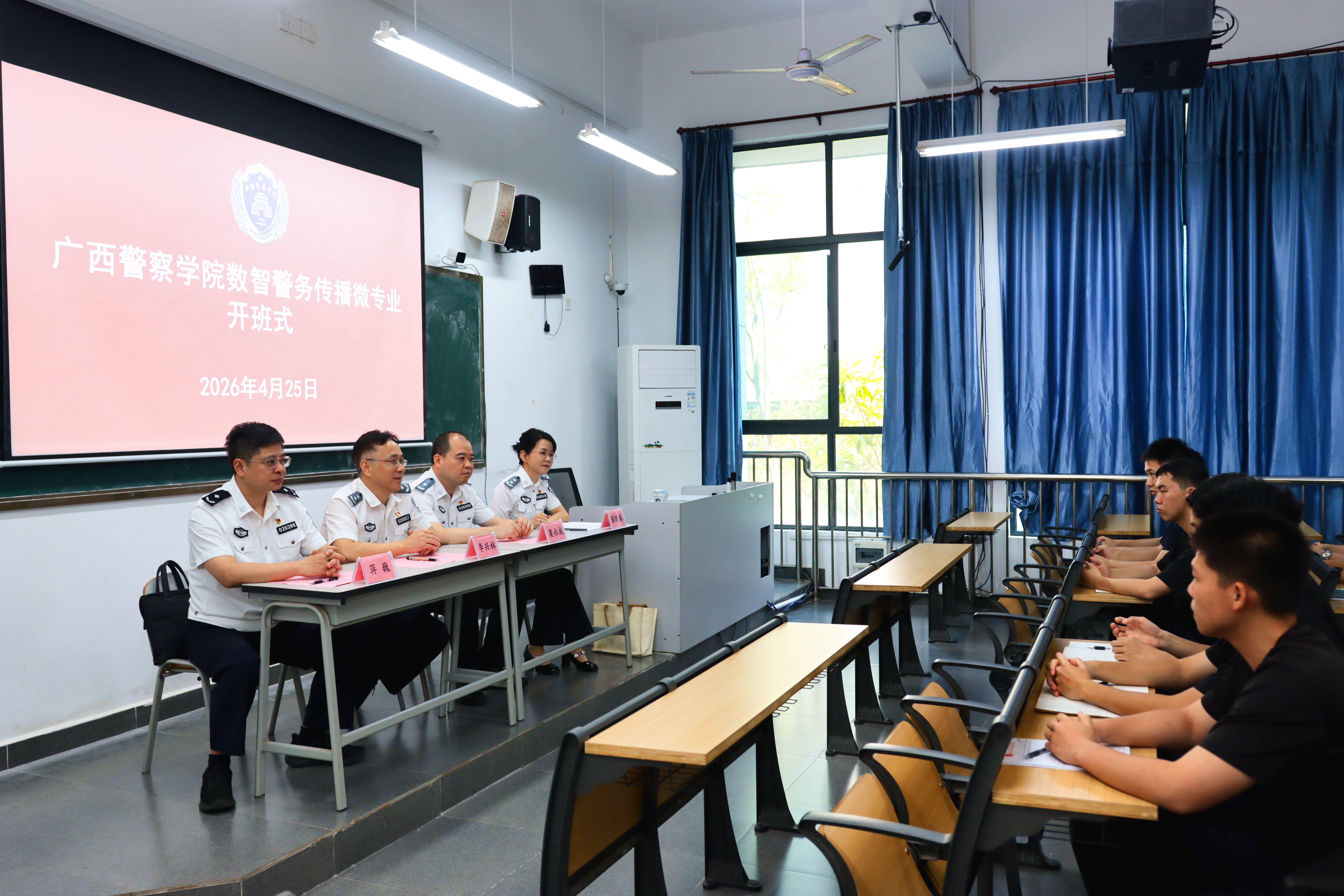 2026年4月25日,广西警察学院“数智警务传播”微专业开班仪式在仙葫校区举行。学校党委委员、副校长李兴林、教务处处长莫永成,侦查学院党总支书记、院长蒋巍和张晓春教授及微专业全体同学参加了开班仪式。