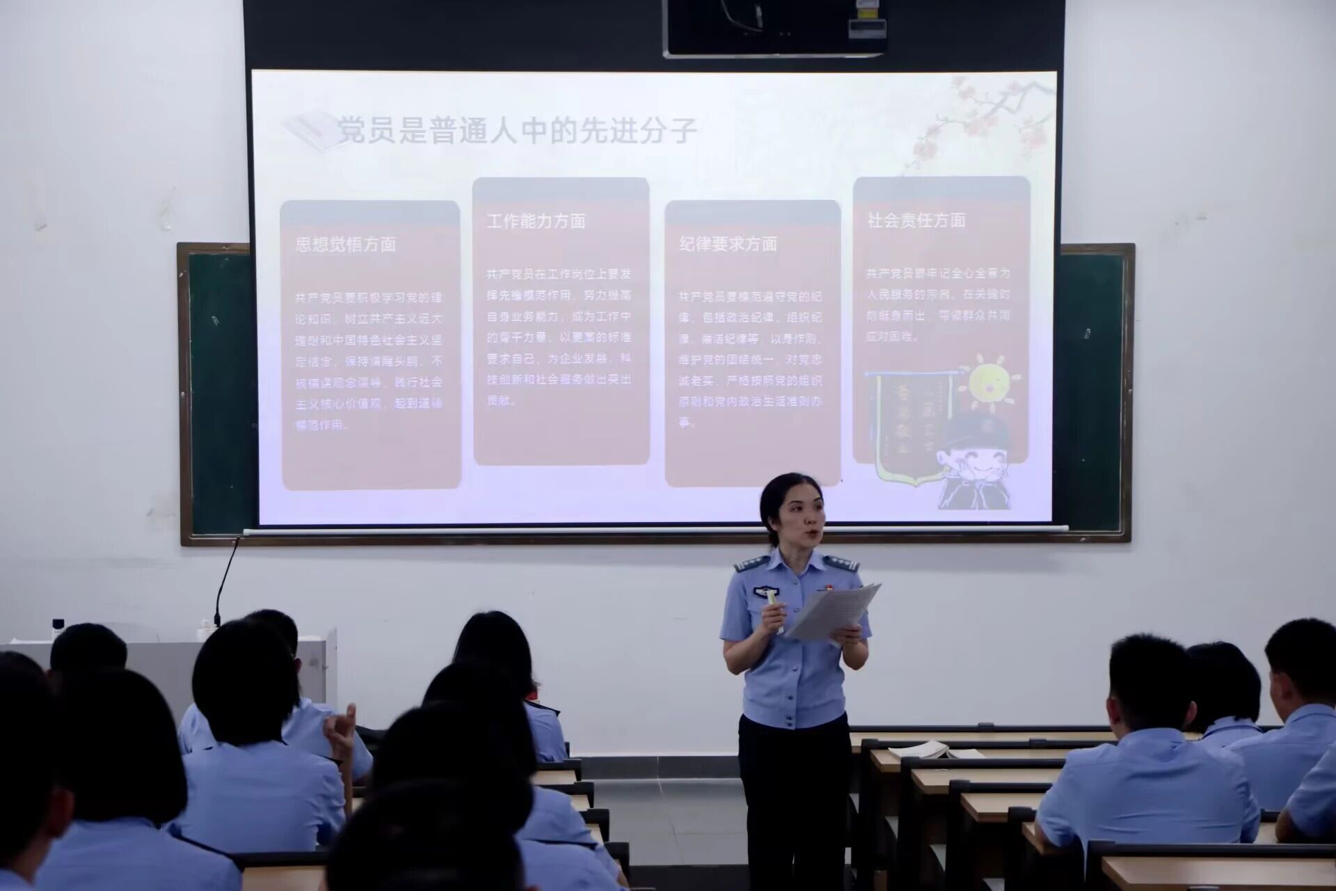 6月23日,党总支书记李德杰从中国共产党的八项规定,党纪党风进行了讲解,明确了作为党员应保持的优良作风,拒绝不良诱惑,加强了学员们的廉政教育。