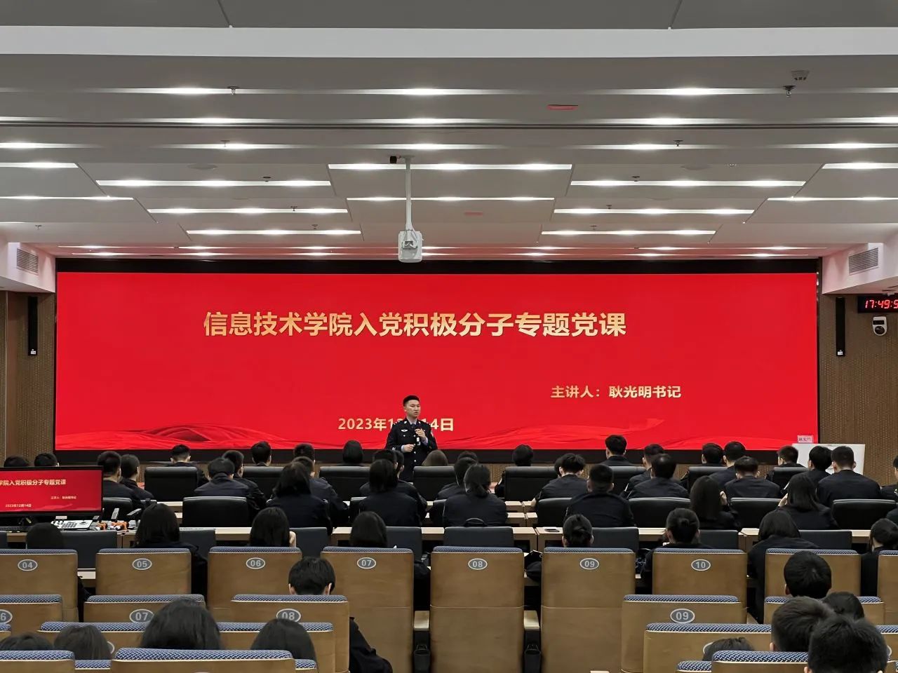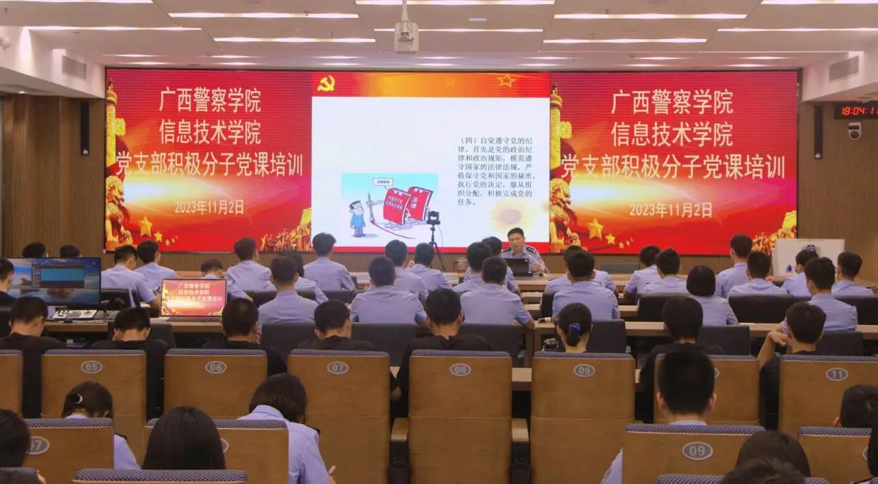 为深入贯彻落实党的二十大精神,帮助我院入党积极分子深刻认识党员的义务。我院于2023年11月份、12月份在仙葫校区智慧公安研训基地共开展四次党课培训。党课培训分别由党总支书记李德杰,党总支副书记邓新华,学生第一支部书记韦新宇,学生第三支部书记耿光明主讲。
