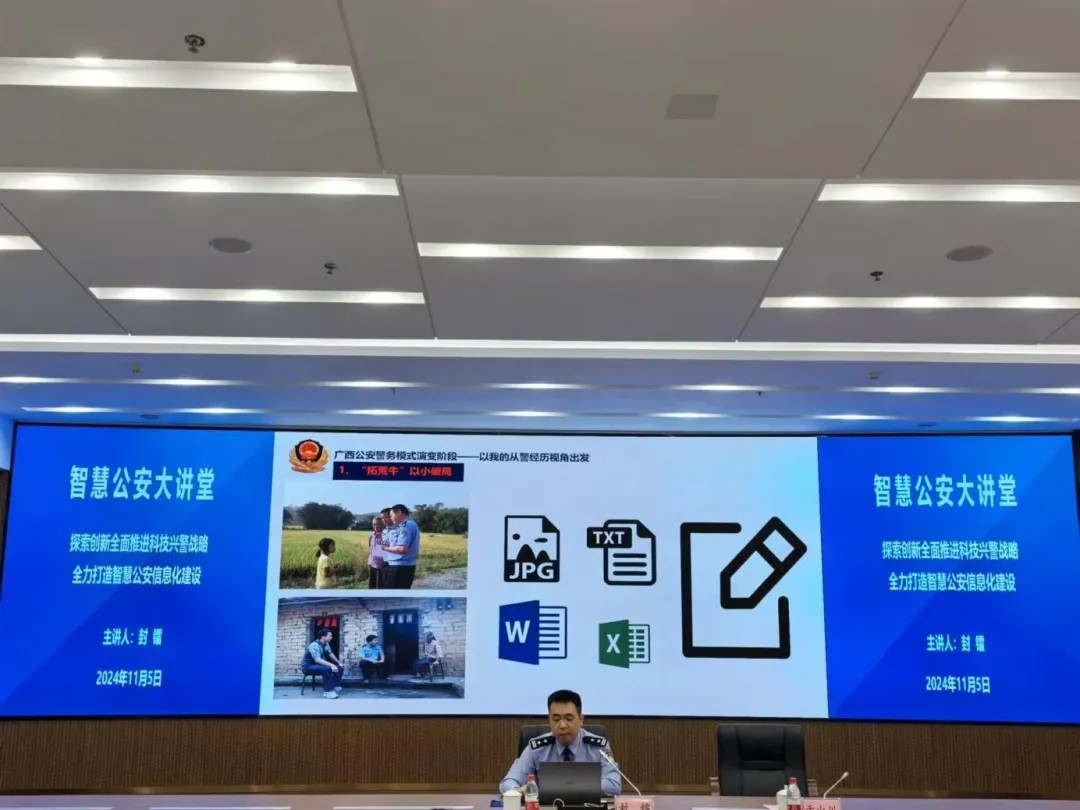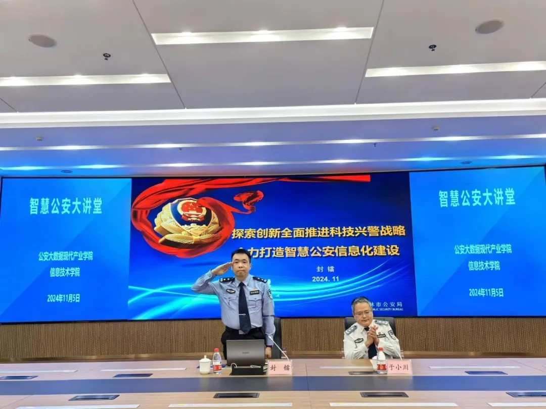 为深入贯彻落实“科技兴警”重要部署,营造浓厚的学术氛围,公安大数据现代产业学院于11月5日15时,在智慧公安研训基地举办智慧公安大讲堂讲座。本次讲座特别邀请了玉林市公安局防盗反劫联网监控中心政治委员封镭同志作为主讲嘉宾。讲座主题为《探索创新全面推进科技兴警战略 全力打造智慧公安信息化建设》。封镭同志以自己多年丰富的从警经历为线索,介绍了广西公安警务模式的演变。从他的分享中,不仅可以见证广西公安从传统警务到现代警务的转变,也能深刻感受到公安工作与时俱进的重要性。封镭同志还深入分析了当前公安信息化发展的机遇、挑战和问题,指出信息化建设不仅能够提高警务效率,还能够更好地服务于人民群众。最后,封镭同志结合自己在警察学院的学习经历鼓励同学们要珍惜当前学习机会,全身心投入到学习中,在努力追求知识和技能提升的同时也要培养自己作为一名警察的职业素养和责任感。