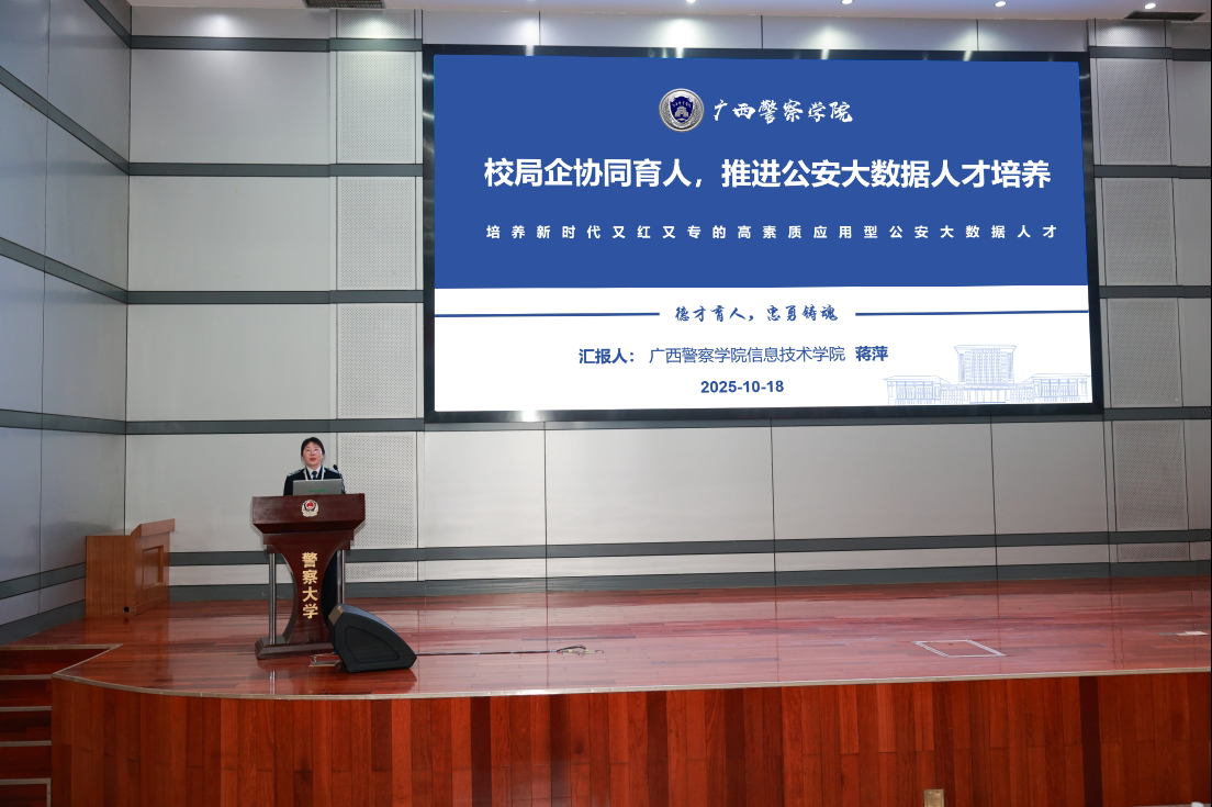 在大会主旨报告环节,我院蒋萍副院长受邀作题为《校局企协同育人,推进公安大数据人才培养》的专题汇报。蒋副院长围绕“协同创新”“产教融合”“实战导向”等关键理念,介绍了我校在推进公安大数据人才培养、建设校局企联合实践平台等方面的具体做法和成效,获得与会专家的高度肯定。