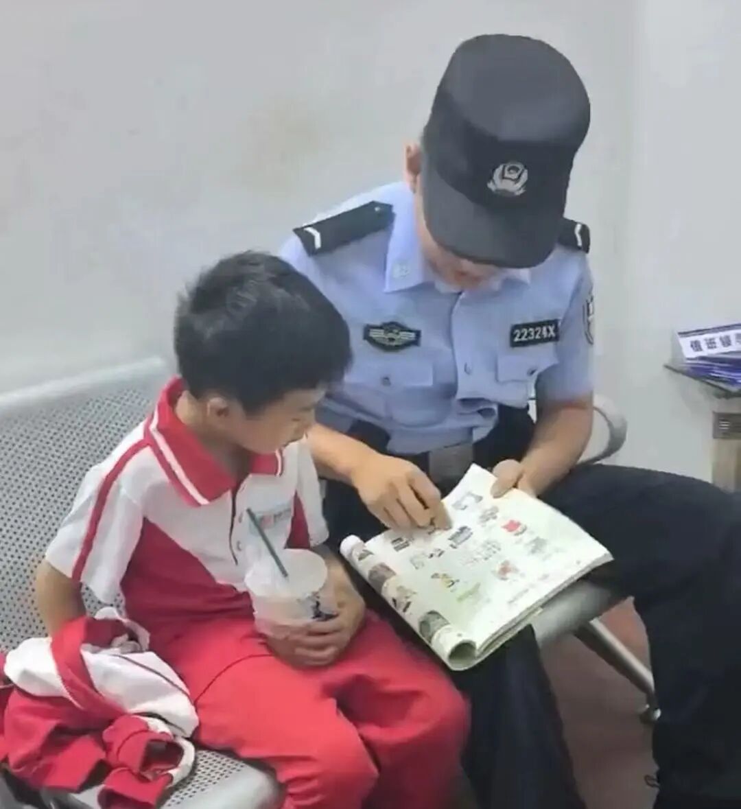 为安抚男孩,陈业伟坐其身旁轻声交流,见他紧握课本,便教读拼音、识汉字:“这个字念‘家’,是爸爸妈妈等你的地方哦。” 男孩逐渐放松并跟着朗读,值班室里洋溢着温馨氛围。