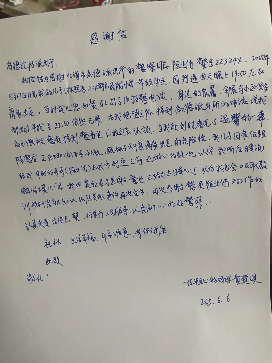 事后,黄女士特意手写了一封感谢信送到派出所,信中饱含深情地点赞陈业伟认真负责、富有爱心,称赞他是为人民服务、认真耐心的好警察。对陈业伟而言,这次帮助迷路男童的经历,不仅是他实习生涯中一段珍贵的回忆,更是他在基层 “课堂” 上的一次生动实践。他用青春的热情和担当,诠释了 “为人民服务” 的宗旨,将 “为群众办实事” 的理念融入到每一个温暖的瞬间。
