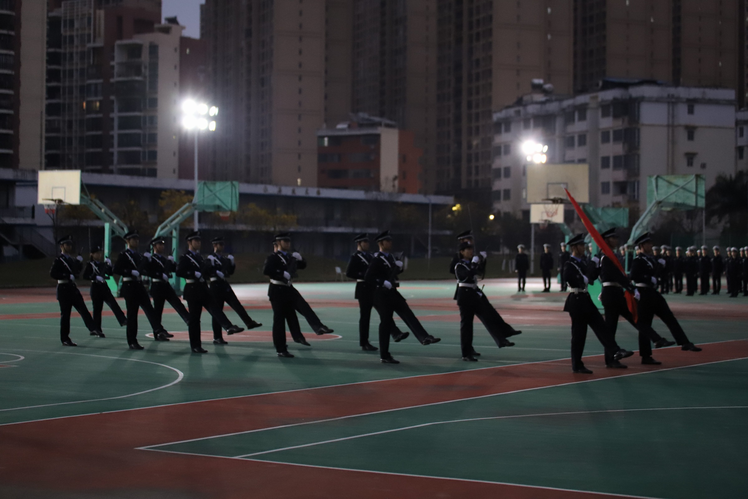 治安学院举行升旗仪式 来源:治安学院团委宣传部 发布时间:2025-03-25 21:57:41 浏览次数: 次 【字体:小 大】 为培养同学们的爱国热情,加强爱国主义教育,2025年3月17日上午6时40分治安学院在仙葫校区举行升国旗仪式。治安学院党总支副书记何洋以及治安学院全体同学参加本次升旗仪式。“正步走!”,随着响亮有力的口令声,国旗护卫队步伐铿锵,身姿挺拔地护送神圣的国旗至升旗台下。 升旗仪式开始,全体庄严肃立。庄严的国歌响起,五星红旗迎风飘扬,治安学院全体师生面向国旗庄严敬礼。编辑:罗涵丹审核:胡芳签发:唐祖坤 分享到: 【打印正文】