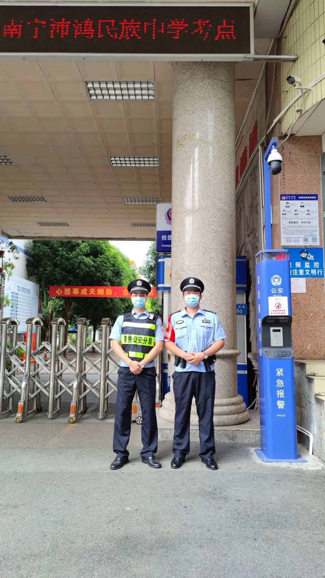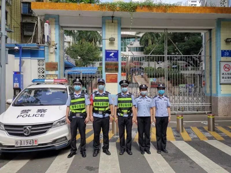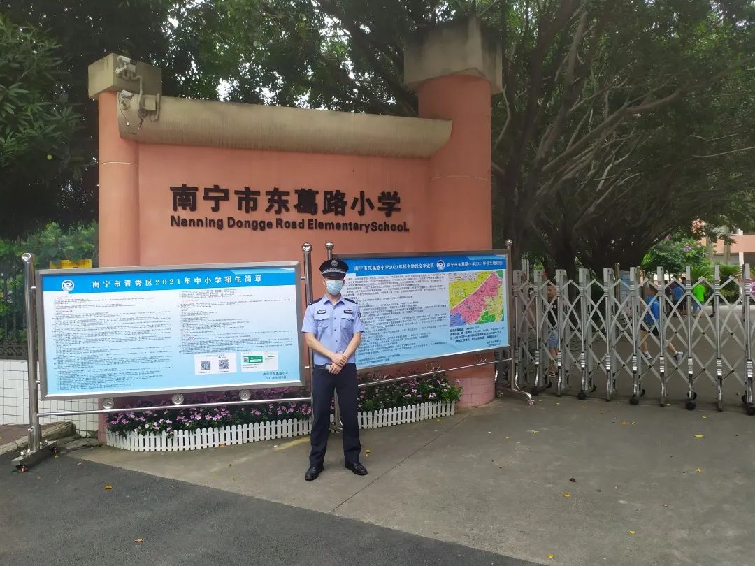 滨湖派出所增援学警廖世辉、庞智鑫在值班当天听从带队领导安排前往南宁市沛鸿民族中学开展巡逻执勤工作,确保考生中考顺利进行。