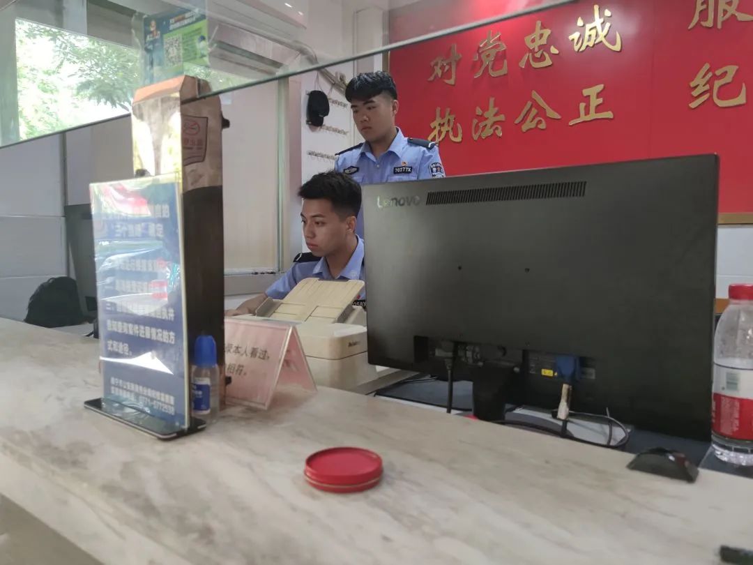 滨湖派出所增援学警庞智鑫、廖世辉在值班室接待群众,为群众解决困难。