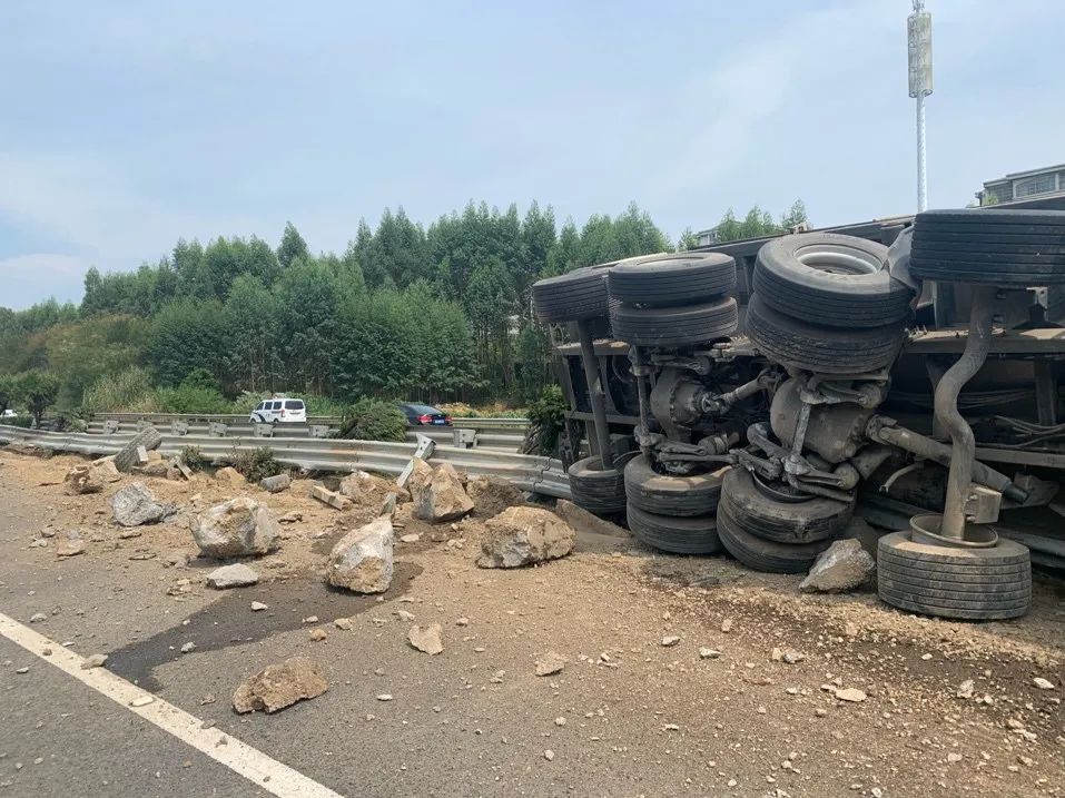 2021年9月10日,在从柳州东高速入口开车前往泉南高速公路新兴服务区治安卡点的路途中,前方一辆大型工程作业车辆因路面气温过热导致轮胎爆炸,一头扎向公路中央隔离防撞钢梁,侧翻后仍滑行数十米,巨大的冲击力导致车辆零部件、公路地基飞溅至高速公路往返共五条车道,对通行车辆造成巨大危险。事故十分严重,实习生陈泓廷、罗钰淇立即配合民警对现场进行救援处置工作。