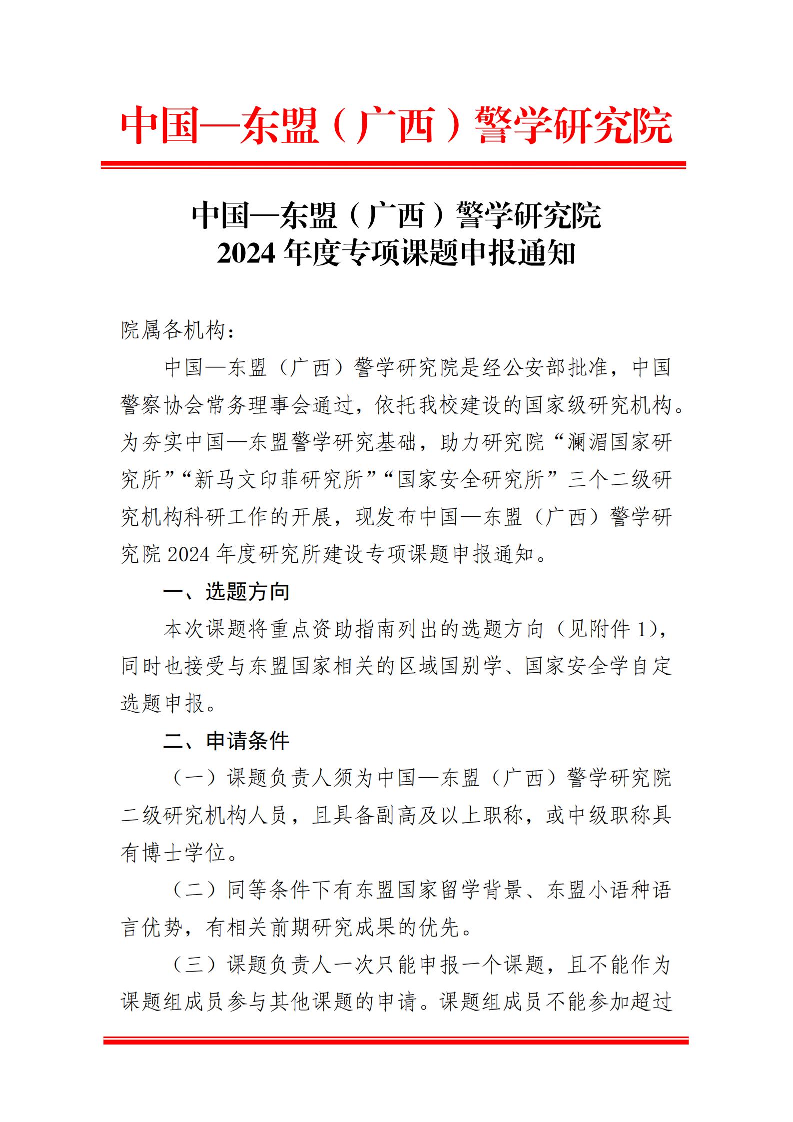 中国—东盟(广西)警学研究院 2024 年度专项课题申报通知 来源: 发布时间:2024-08-24 17:10:00 浏览次数: 次 【字体:小 大】 附件1:2024年度专项课题指南.docx附件2:2024年度专项课题申请书.docx附件3:2024年度专项课题论证活页.docx 分享到: 【打印正文】