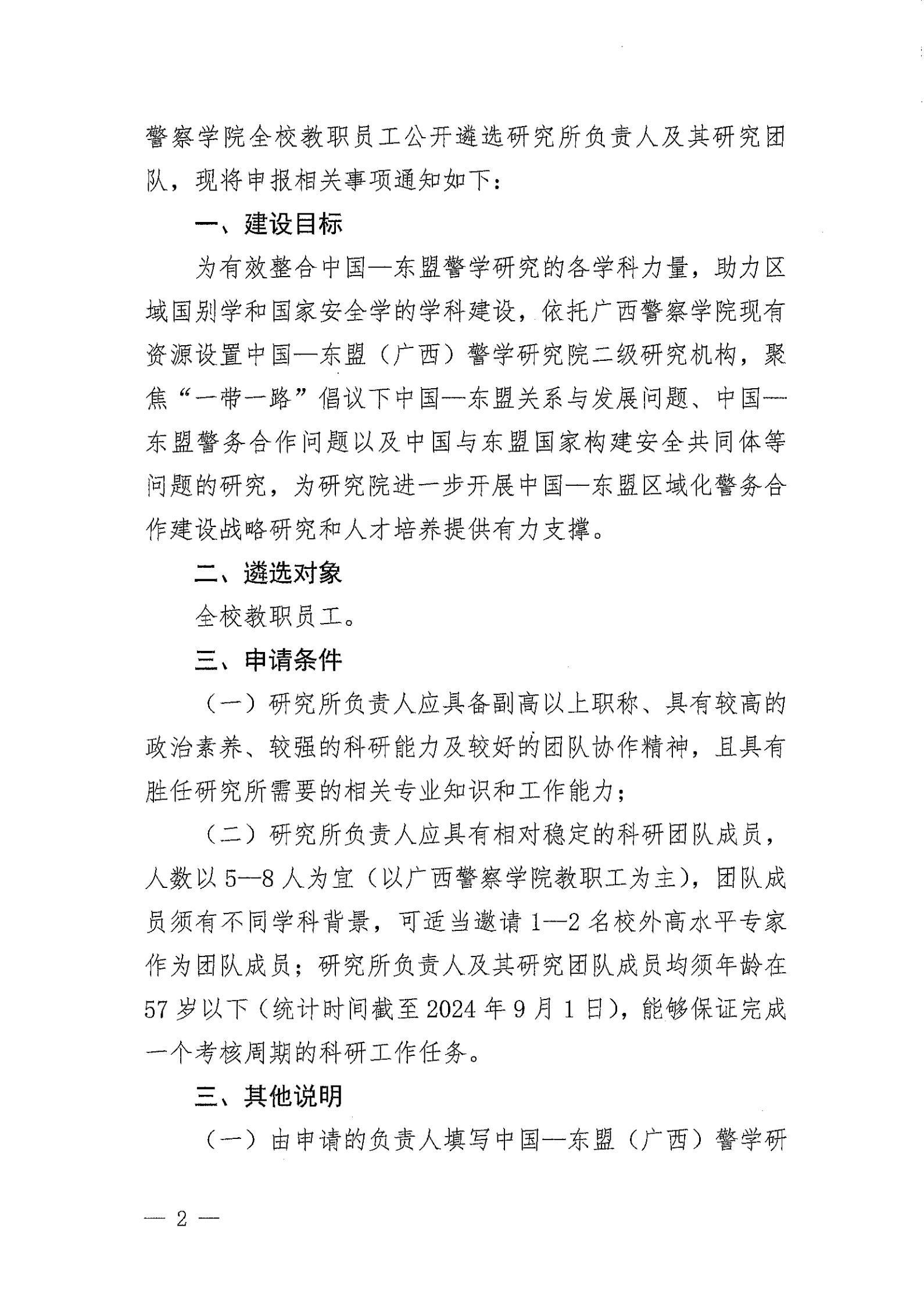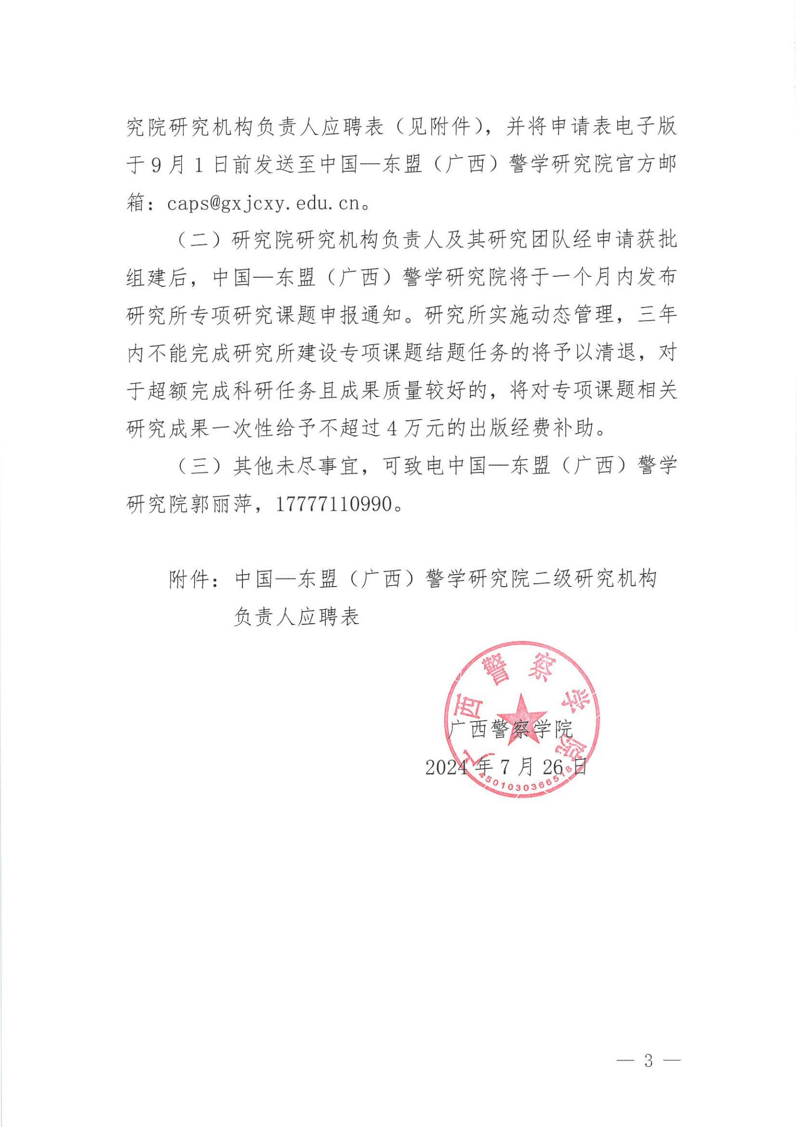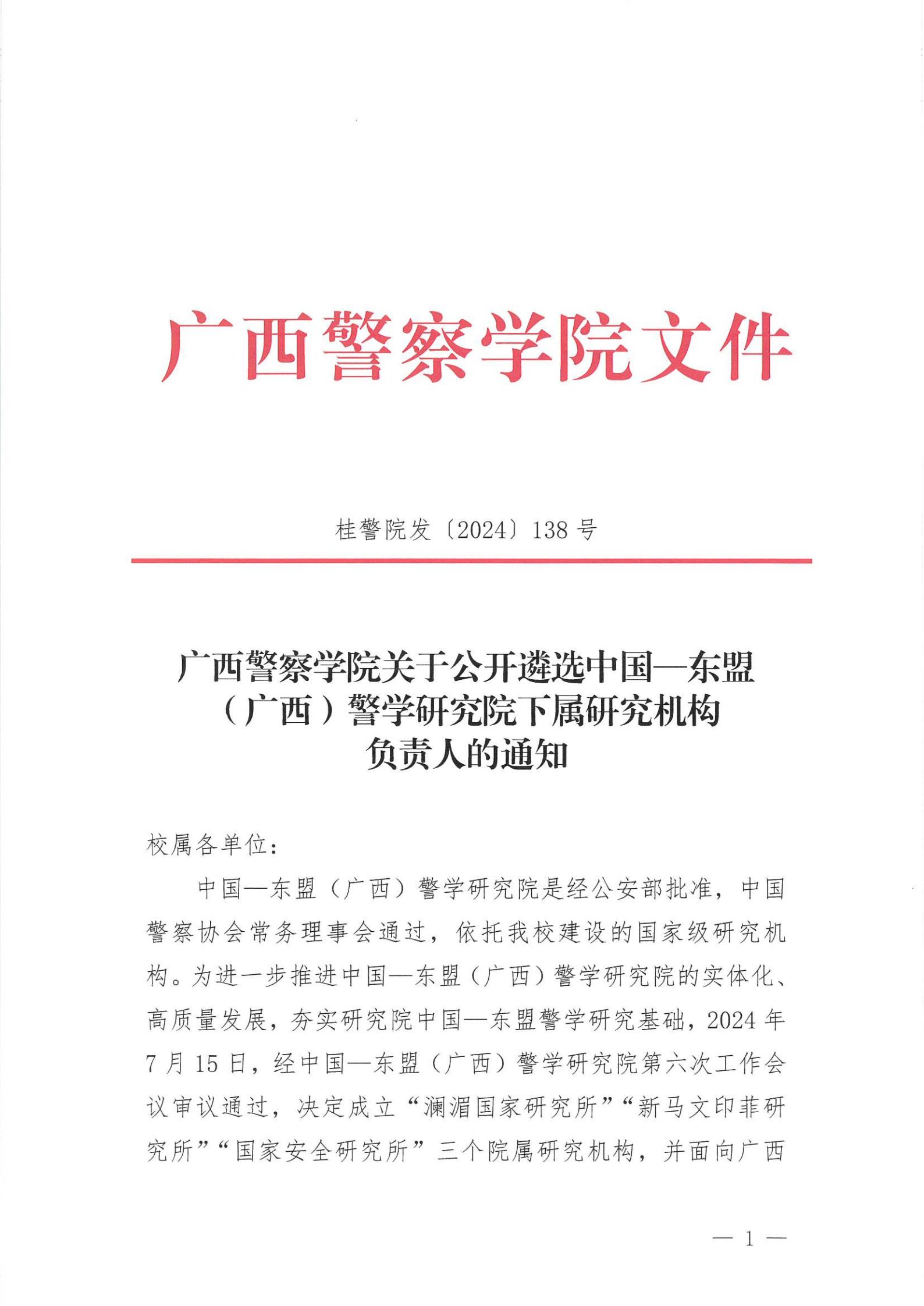 广西警察学院关于公开遴选中国—东盟 (广西)警学研究院下属研究机构负责人的通知 来源: 发布时间:2024-07-26 17:25:26 浏览次数: 次 【字体:小 大】 附件:中国—东盟(广西)警学研究院二级研究机构负责人应聘表.doc 分享到: 【打印正文】