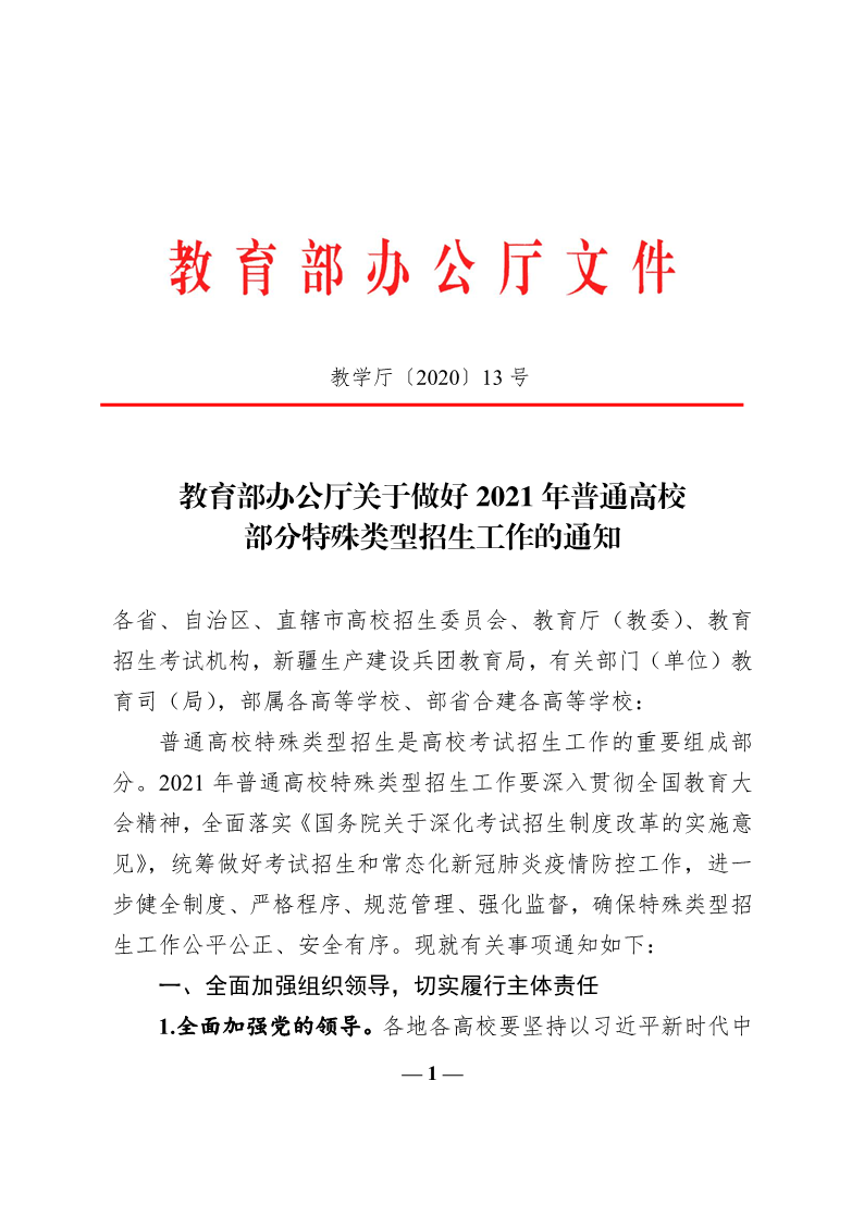 教育部办公厅关于做好2021年普通高等学校部分特殊类型招生工作的通知