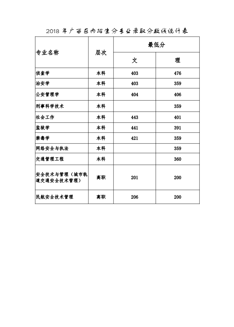 2018年广西区内招生分专业录取分数线统计表