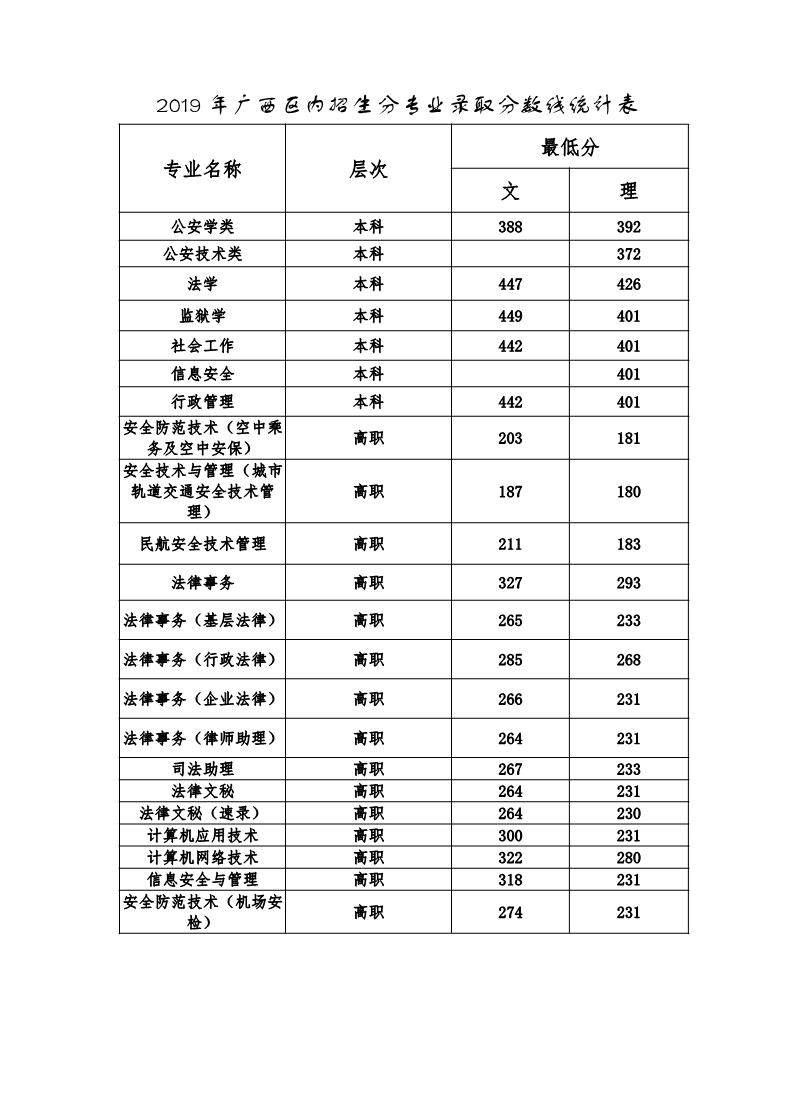 2019年广西区内招生分专业录取分数线统计表