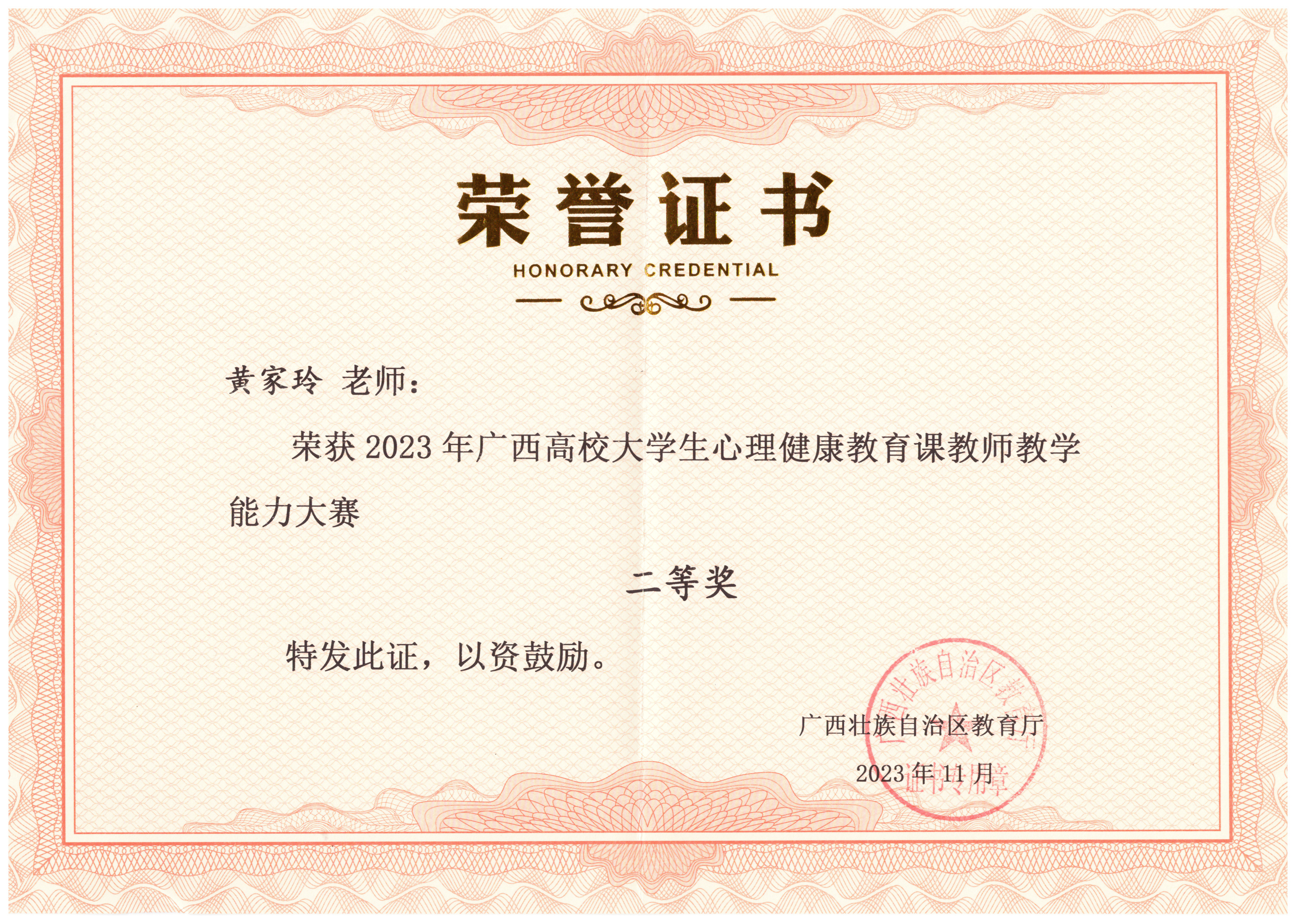 广西高校大学生心理健康教育教学比赛二等奖